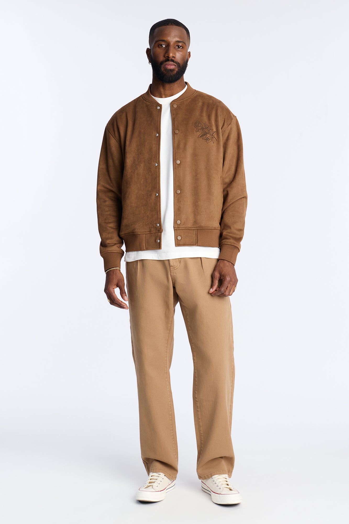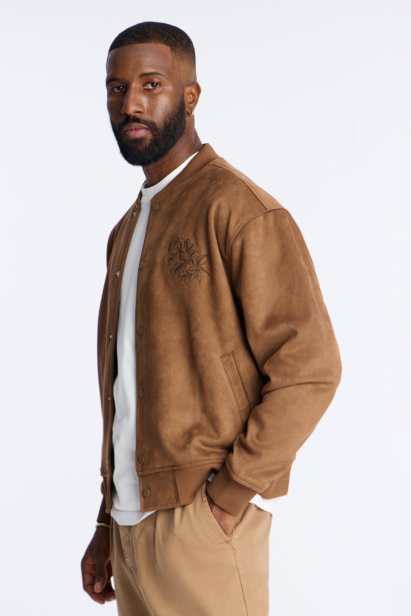 Faux Suede Embroidered Blossom Bomber Jacket Tan