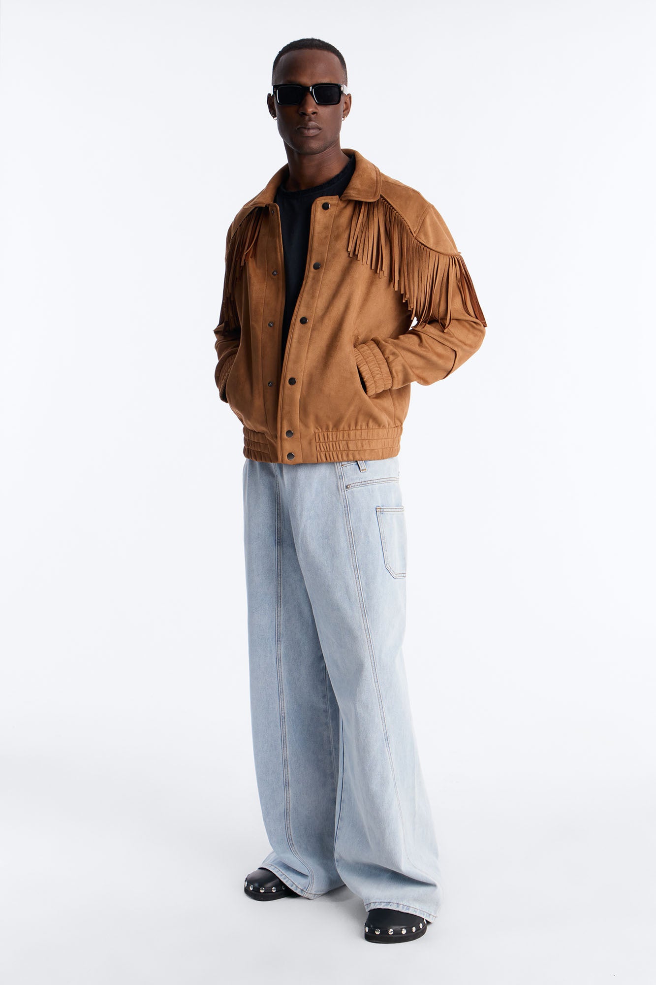Elevate your festival style with the Fringed Festival Grounds Faux Suede Jacket in a rich camel hue. Crafted from premium faux suede, this jacket offers the luxurious look and soft feel of genuine suede without any animal products, making it a cruelty-free choice for ethical fashion lovers. The standout fringed detailing along the sleeves, hem, and front adds a bohemian flair and movement, perfect for dancing through music festivals, outdoor concerts, or casual outings. Designed with a relaxed fit, it features a front zipper closure, two handy side pockets, and a lined interior for comfort in cooler evenings. Pair it with jeans, boots, and layered accessories for an effortless boho-chic vibe. Machine washable for easy care, this versatile piece transitions seamlessly from day to night. Ideal for fall festivals, summer nights, or everyday layering. Embrace sustainable style with this must-have faux suede jacket.