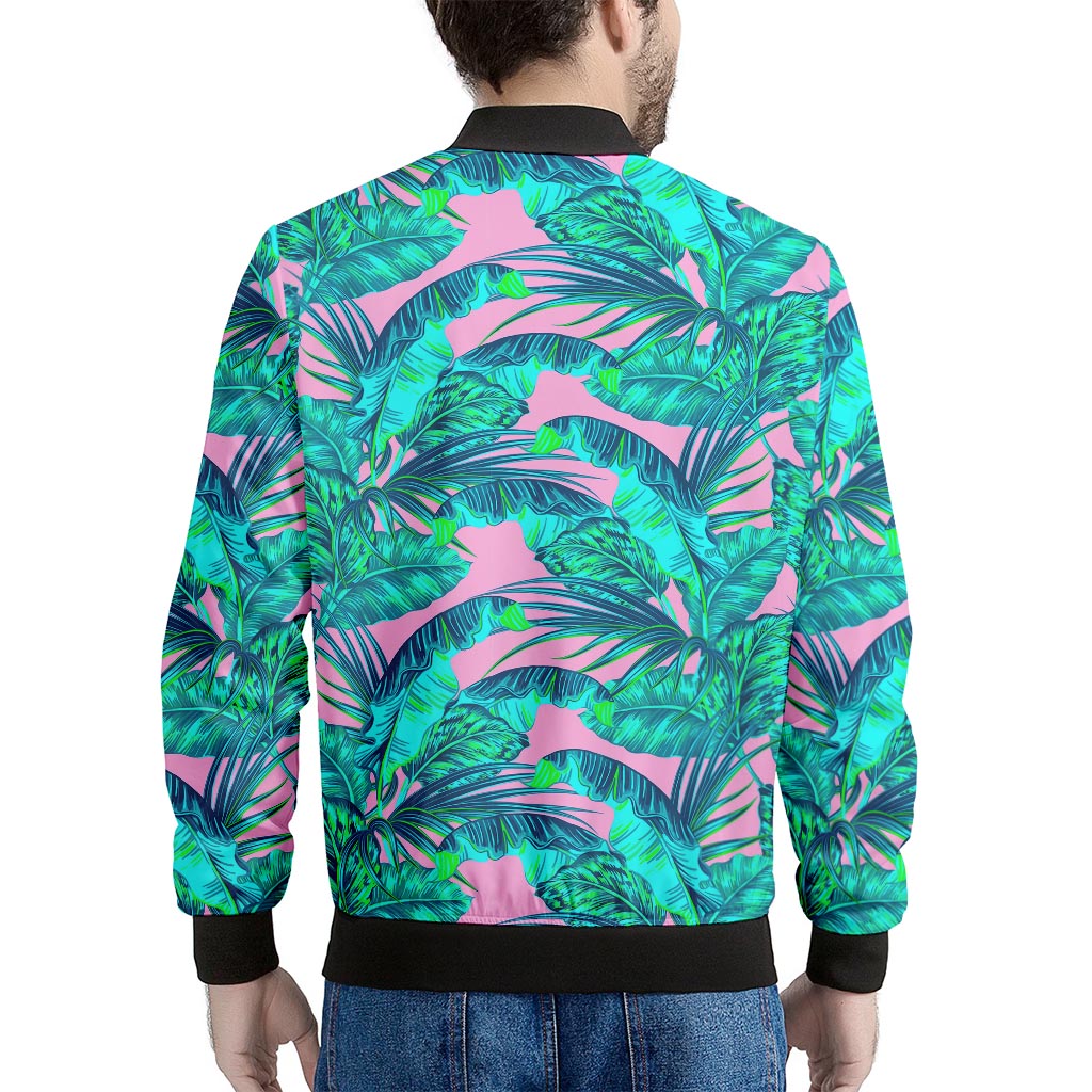 Pink Teal Tropical Leaf Pattern Print Men’s Bomber Jacket