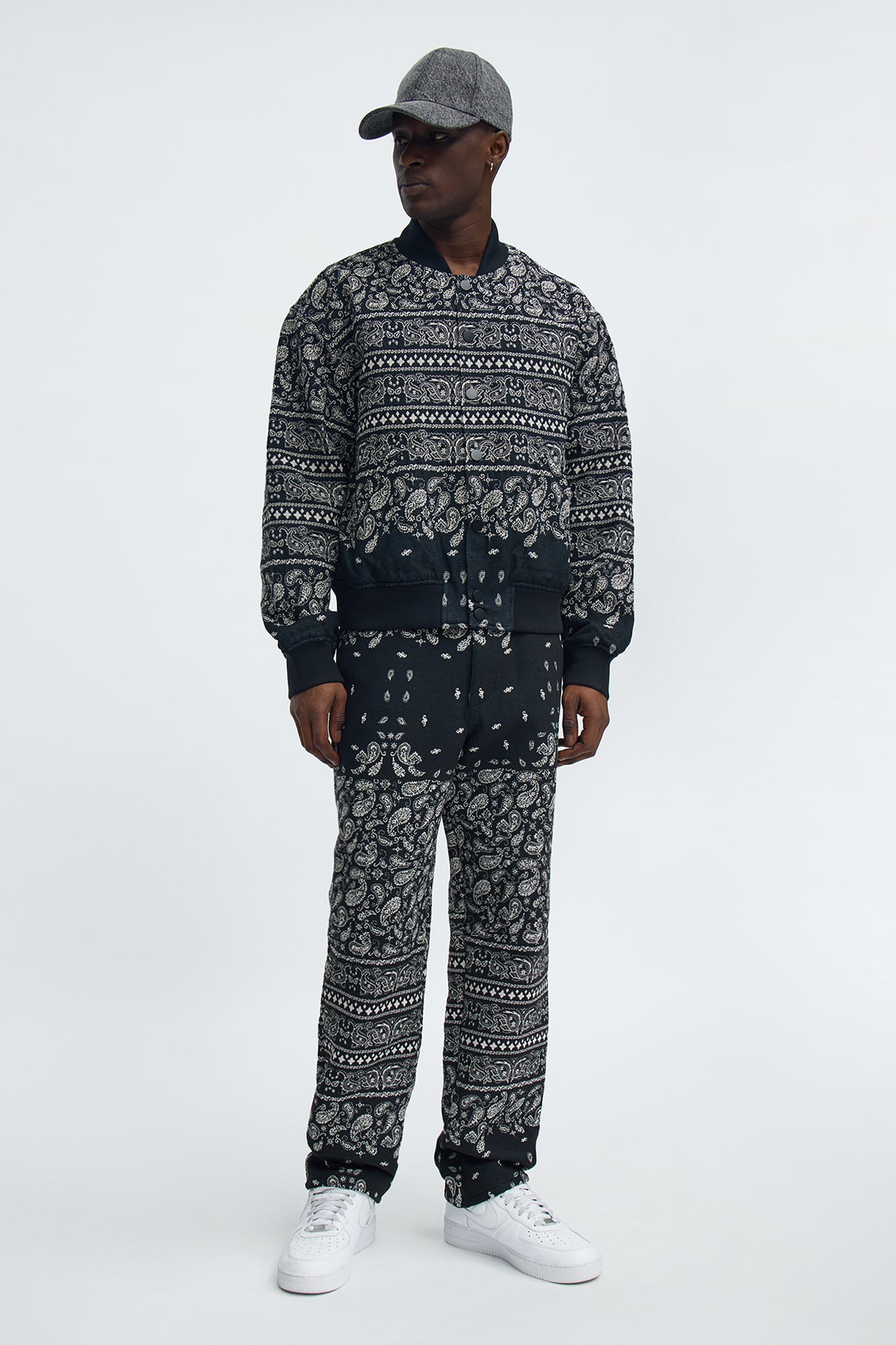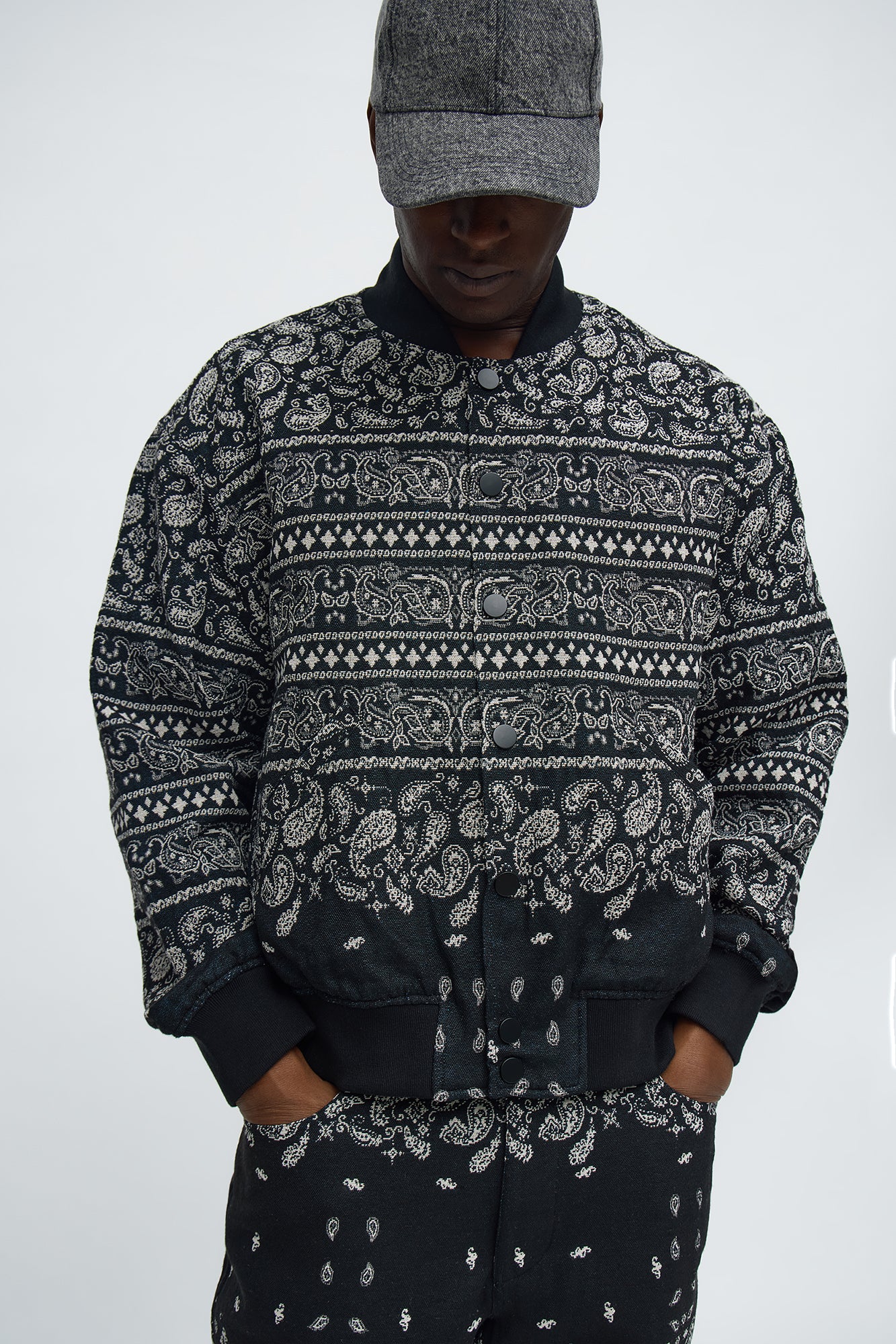 Elevate your casual wardrobe with this relaxed-fit paisley jacquard bomber jacket in sleek black. Crafted from premium jacquard fabric, it features an intricate paisley pattern that adds a touch of artistic flair to the classic bomber silhouette. The relaxed cut ensures all-day comfort, making it perfect for layering over tees, hoodies, or shirts. Key details include a ribbed collar, cuffs, and hem for a structured look, full zip-front closure for easy wear, and handy side pockets for essentials. Ideal for transitional weather, streetwear styling, or everyday outings. Pair it with jeans, chinos, or joggers for versatile outfits. Durable construction maintains shape and color wash after wash. Available in black for a timeless, versatile piece that suits any occasion.
