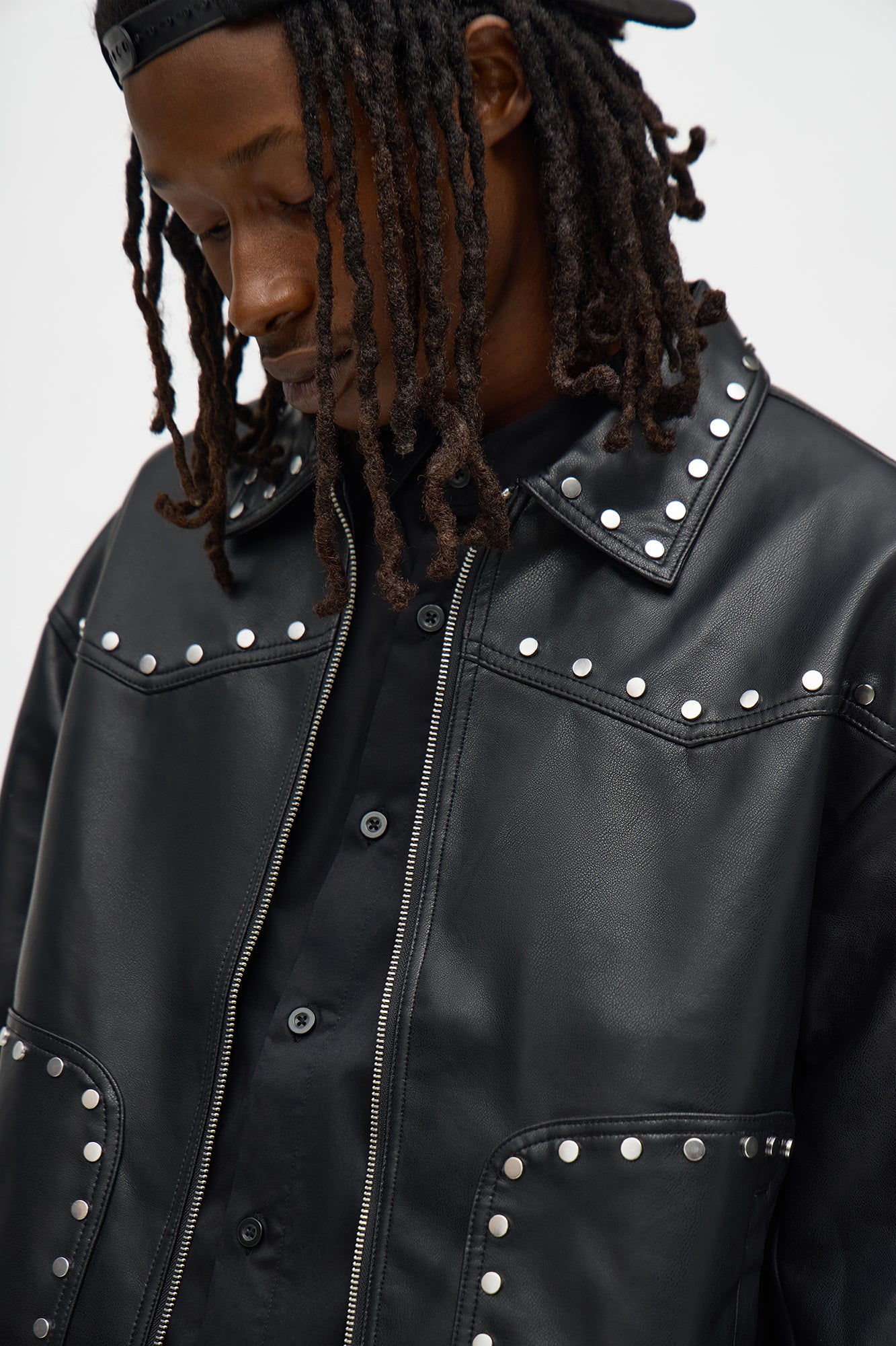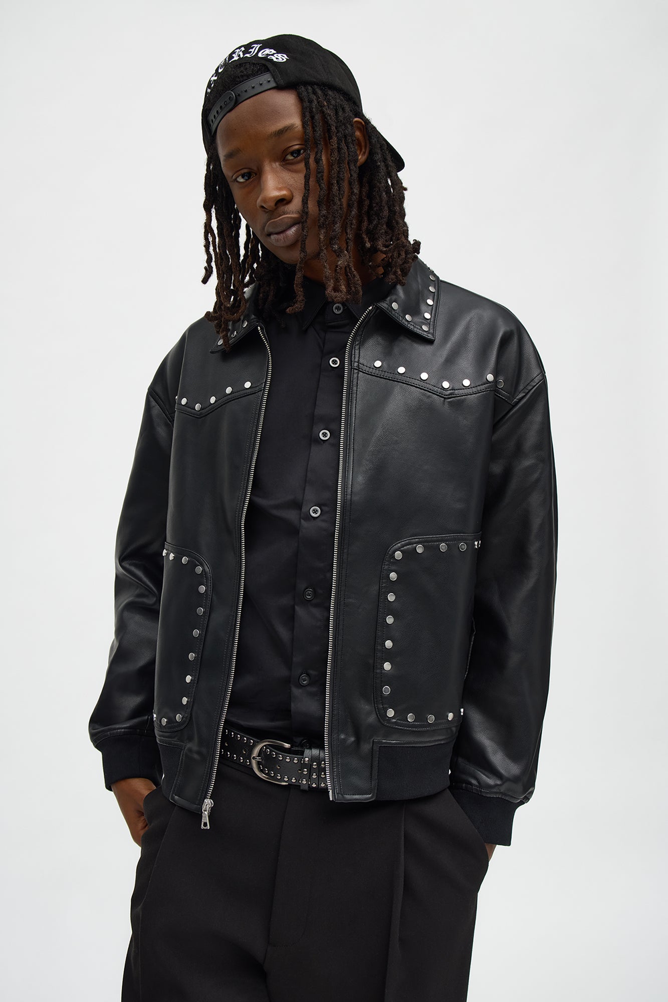 Elevate your streetwear style with the Relaxed Riff Studded Faux Leather Bomber Jacket in sleek black. Crafted from high-quality vegan faux leather, this bomber jacket features edgy studded detailing along the shoulders and cuffs for a bold, rebellious vibe. The relaxed fit offers comfortable movement, making it perfect for layering over hoodies, tees, or graphic shirts. Ribbed knit collar, cuffs, and hem provide a classic bomber silhouette with a modern twist. Ideal for casual outings, concerts, or nightlife, this versatile piece pairs effortlessly with jeans, cargo pants, or skirts. Durable stitching and zip-front closure ensure longevity. Available in black for an all-season essential that’s cruelty-free and easy to care for. Embrace urban edge without compromising on comfort.